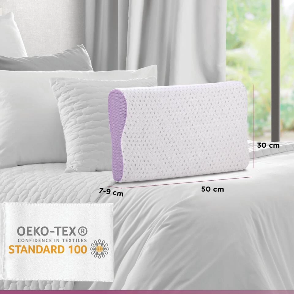 Dankzij de anatomische vorm van het Lavendel Memory kussen liggen uw nek en wervelkolom elk moment van de nacht in de juiste positie. Het biedt de beste ondersteuning aan de drukpunten onder de schouders, nek en hoofd voor de meest correcte uitlijning van alle wervels.