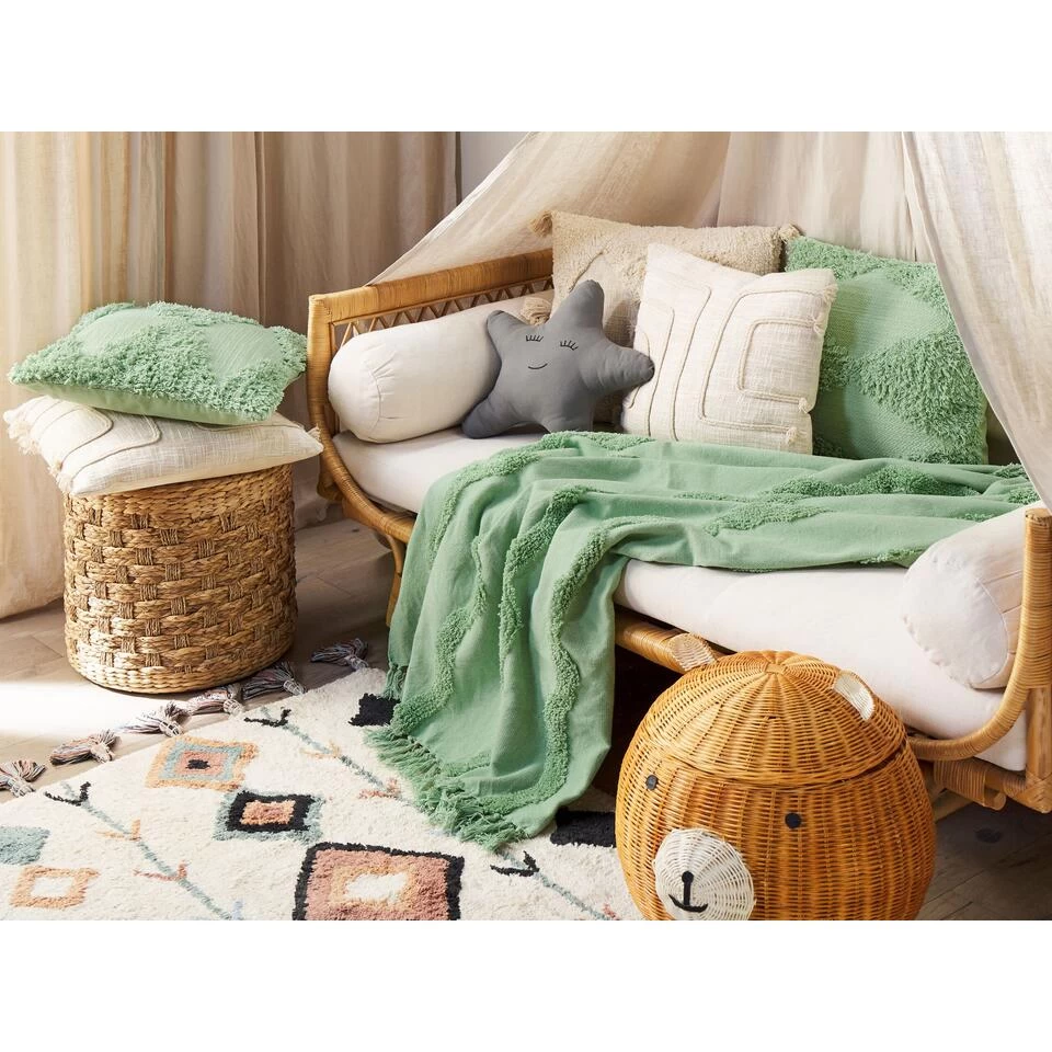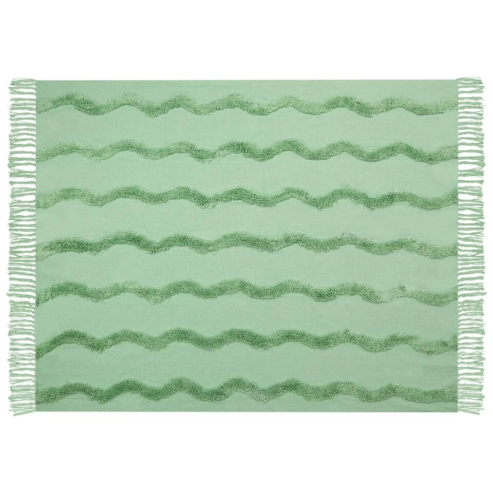 Modern katoenen plaid in groen. Geef je interieur een knus gevoel en wikkel jezelf in een super zacht deken. Dit unieke deken is handgemaakt met de uiterste precisie van hoge kwaliteit katoen waardoor je lekker warm blijft op koude avonden. Het simpele ontwerp van deze accessoire is verrijkt met franjes en een golvend patroon met fluffy draad.