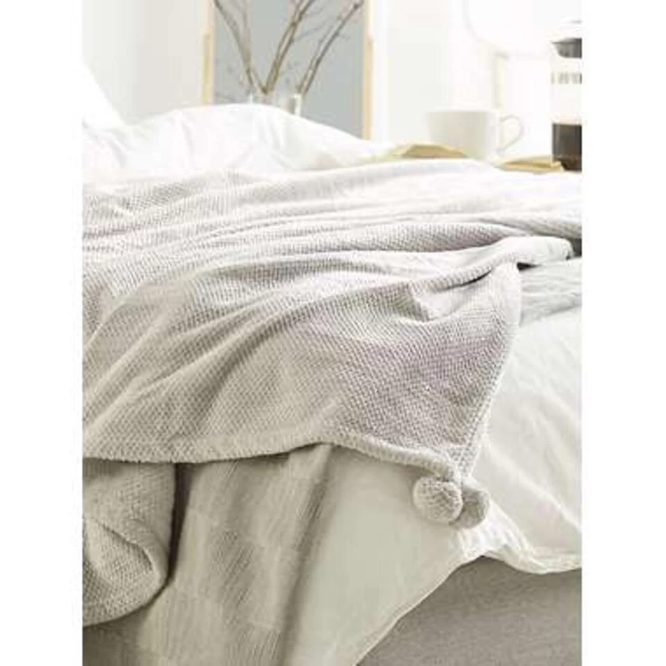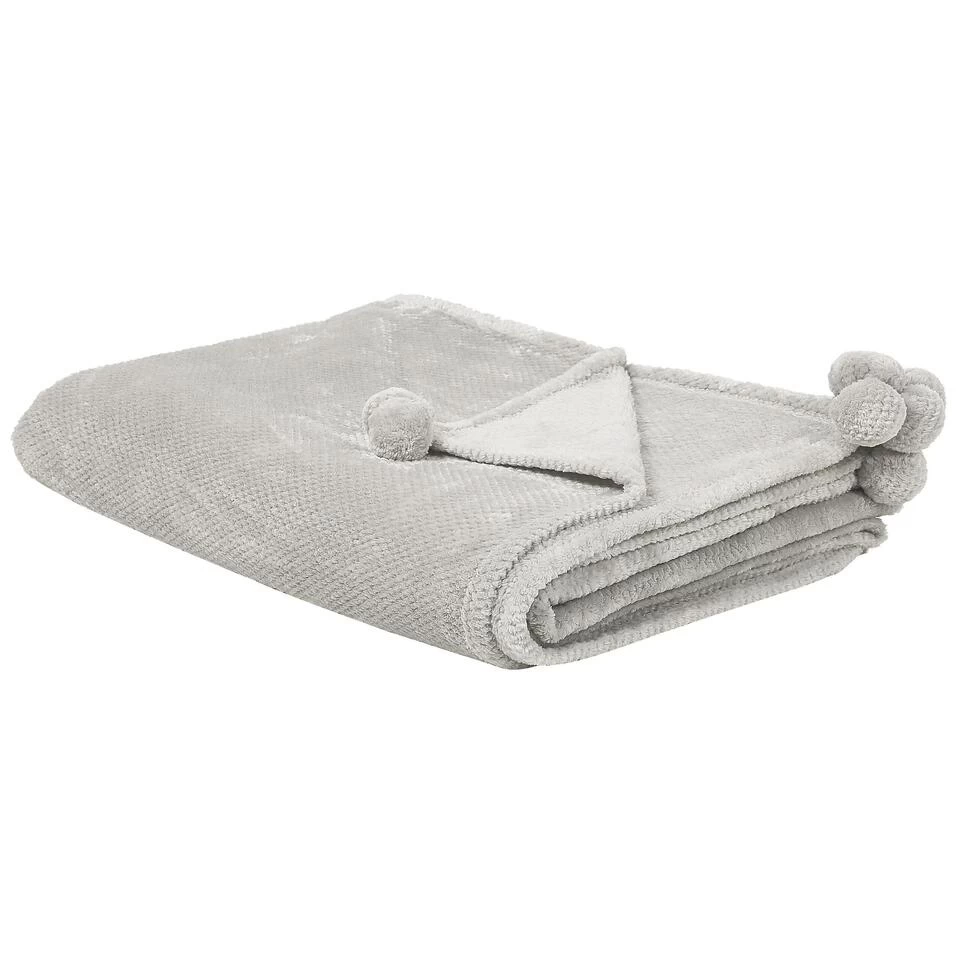 Fluffy, warme deken . Een warme deken van het beste materiaal voor gezellige momenten op de bank of op het terras. Het heeft pluizige, kleine pompons, is decoratief en veelzijdig te gebruiken.