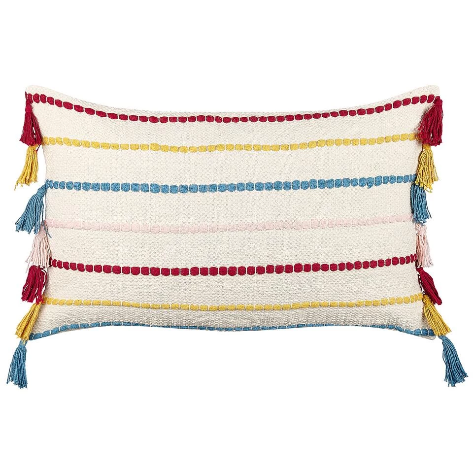 Retro kussen met strepen. Interieuraccessoires in retrostijl brengen kleur in je interieur zonder zich te mengen met de stijl van je huis. Dit sierkussen heeft kleurrijke horizontale strepen en kwastjes aan het uiteinde. Ontspan op de bank en geniet van de pluche vulling van het kussen en de zachte hoes van hoogwaardig katoen.