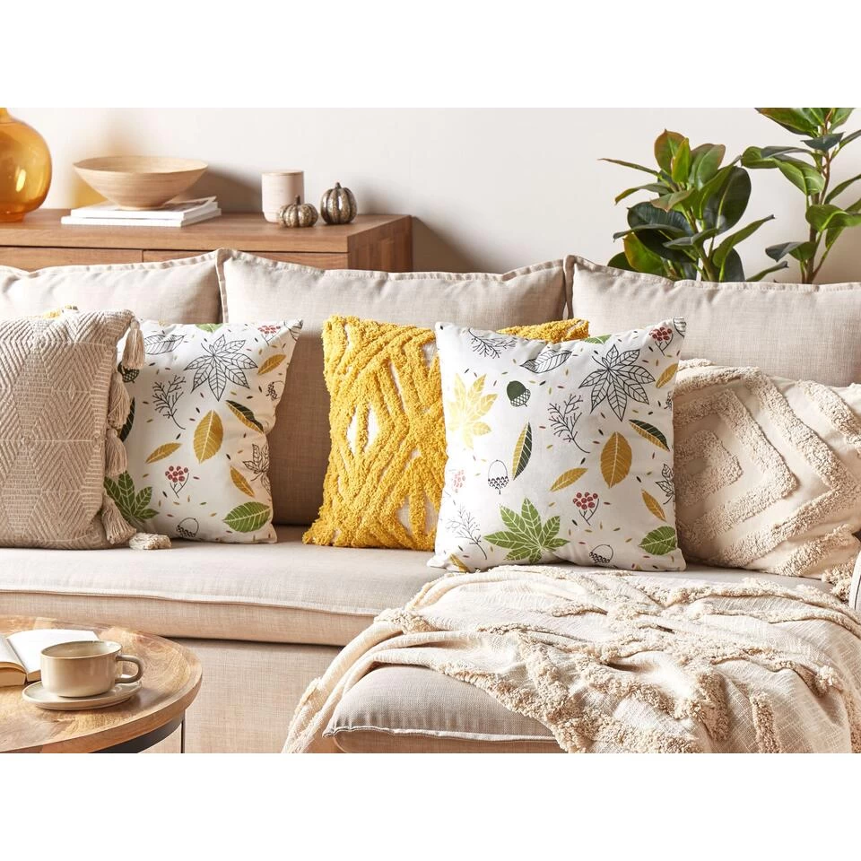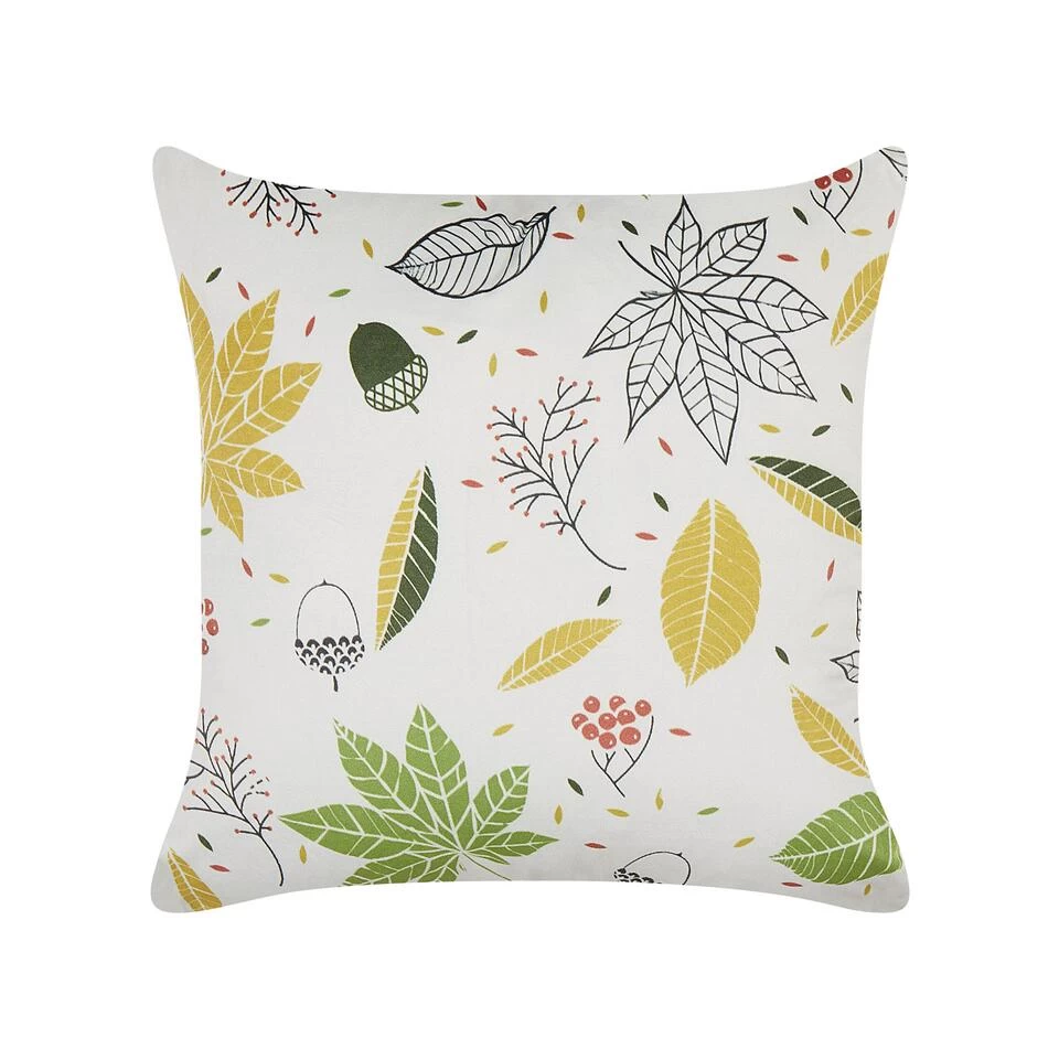 Decoratief kussen met kleurrijk patroon. Versier je bank of bed met dit boho-kussen met een print op beide zijden. De hoes heeft verschillende blaadjes en takjes in verschillende kleuren, waardoor het kussen zeker al je huisgasten zal bekoren. Bovendien is het stuk heel gemakkelijk schoon te maken dankzij een rits aan de zijkant, en aangenaam om aan te raken, omdat het gemaakt is van fluweel.