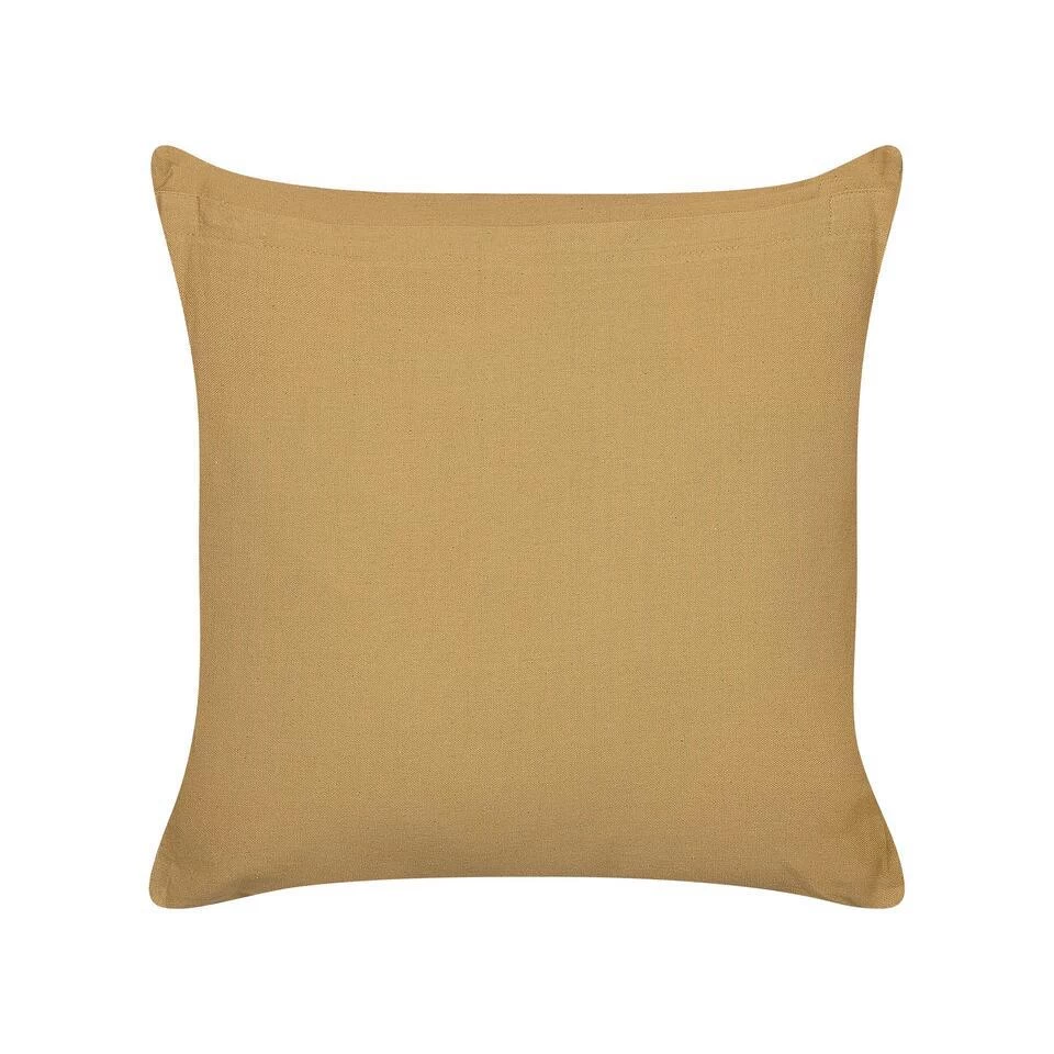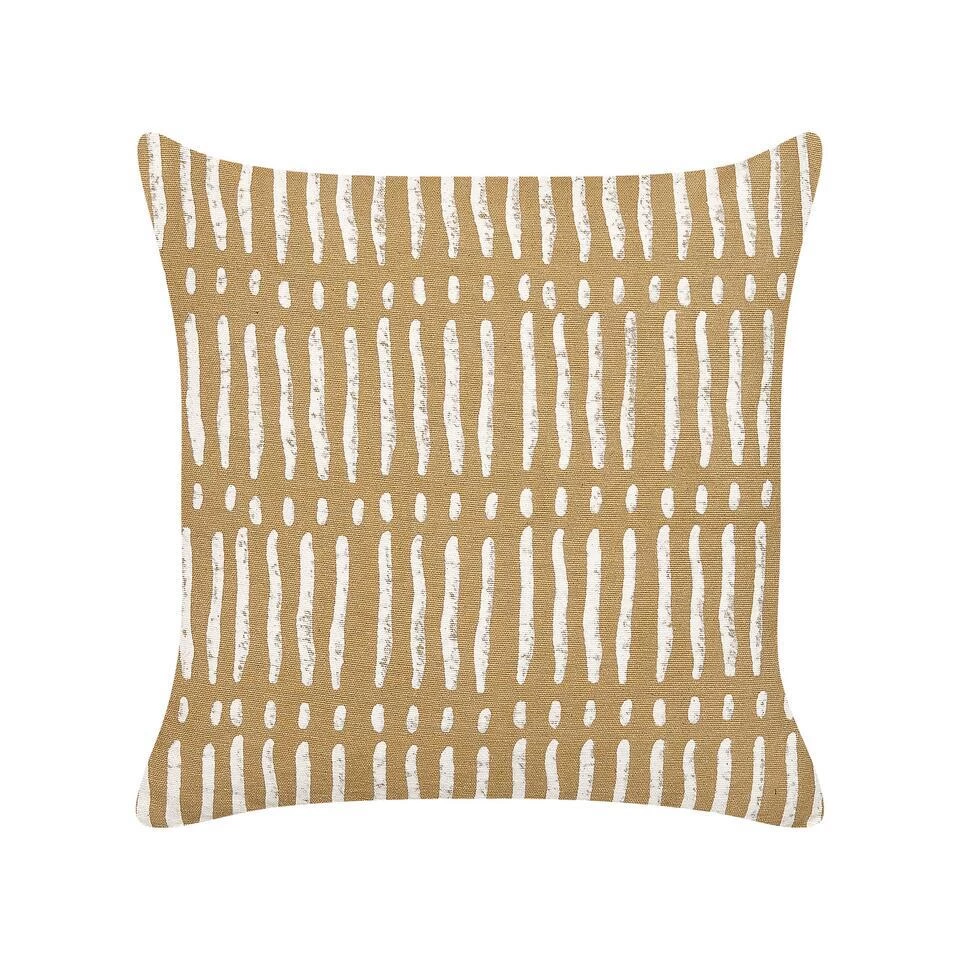 Handgemaakt decoratief kussen met geometrisch patroon. Geef je decor een upgrade en versier je woonkamer of slaapkamer met dit decoratieve kussen in zandbeige kleur. De katoenen hoes is handgemaakt en heeft een zachte vulling en ritssluiting. Het opvallende geometrische patroon is perfect voor moderne en boho interieurs.