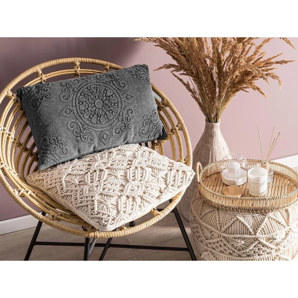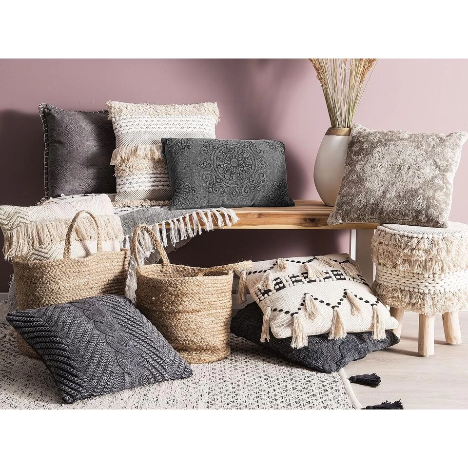 Sierkussen in boho – stijl. Dit donker-grijze decoratieve kussen van hoge kwaliteit inspireert met het boho-ontwerp, geïnspireerd op een mandala-patroon. Dankzij de gegraveerde decoratieve motieven geeft dit woonaccessoire je interieur een gezellige uitstraling – een must-have als je op zoek bent naar unieke accessoires!