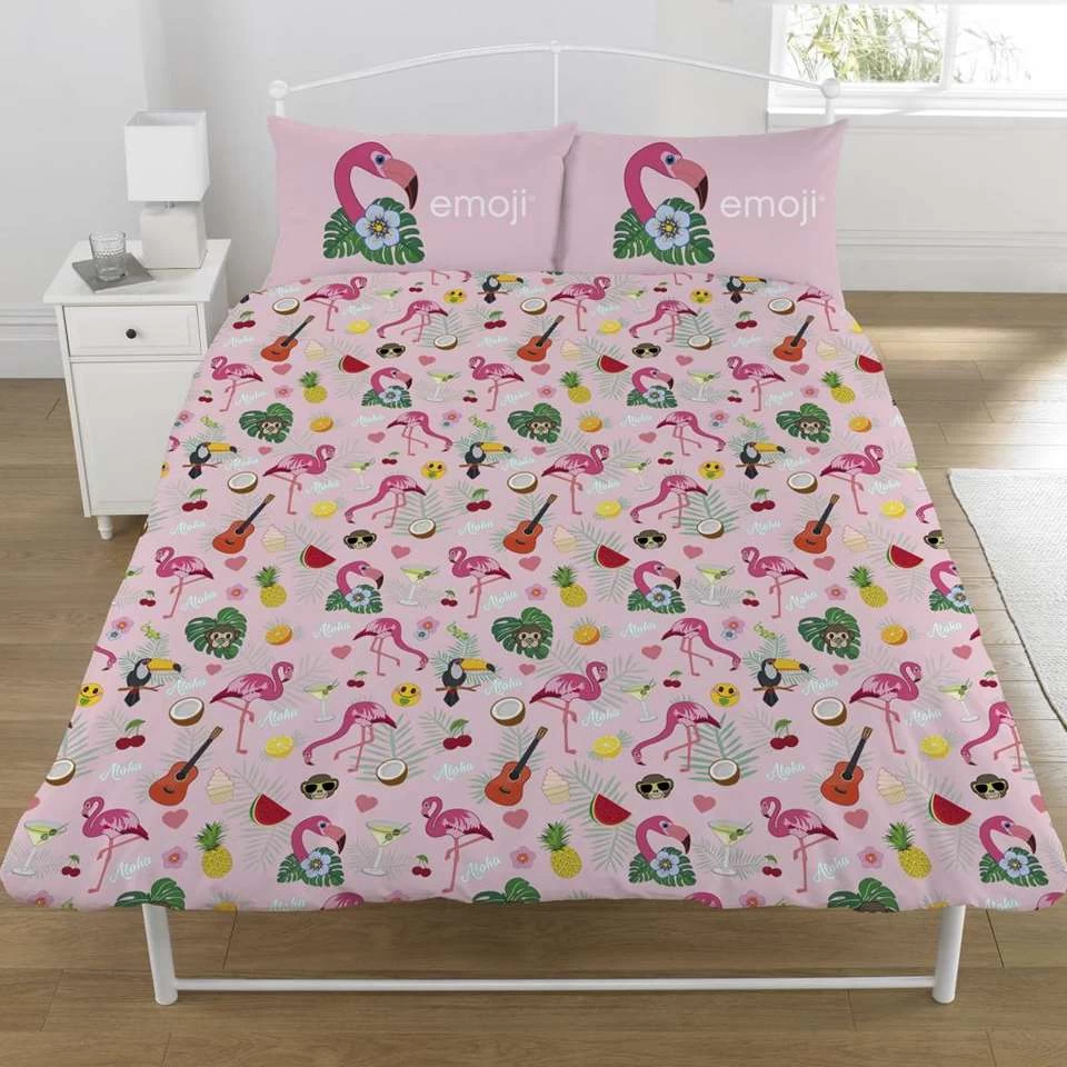Emoji Dekbedovertrek Flamingo. Dit super leuke en kleurrijke dekbedovertrek geeft jouw kamer een vakantie sfeer. Op dit dekbedovertrek is een patroon van verschillende Emoji’s zoals de flamingo, ananas, kokosnoot, kersen en hartjes Emoji’s op een roze achtergrond. Perfect om een vrolijke Emoji fan blij mee te maken.