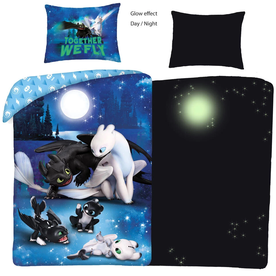Hoe Tem je een Draak Dekbedovertrek, Together we Fly. Dit supercoole dekbedovertrek heeft een glow-effect voor zowel overdag als ’s nachts. Op de voorkant staan de bekende draken uit de film ‘Hoe Tem je een Draak?’ en de achterkant is mooi zwart met een Glow in the Dark maan. Het overtrek is gemaakt van 100% katoen met een extra groot kussensloop. Een geweldig kado voor alle draken-fans.