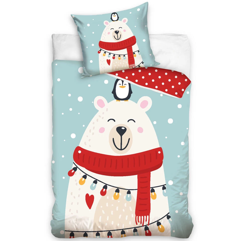 Kerst dekbedovertrek, Beer. Kom helemaal in kerstsfeer met dit grappige dekbedovertrek van een IJsbeer. De beer is versierd met leuke kerstlichtjes en heeft gezelschap van een leuke pinguïn op zijn hoofd. Een leuke blikvanger voor elke slaapkamer tijdens Kerstmis! Het dekbed heeft een dubbelzijdige print, wat een leuk effect geeft bij het opmaken van het bed. Een geweldig cadeau om te geven voor de aankomende feestdagen of voor een verjaardag!