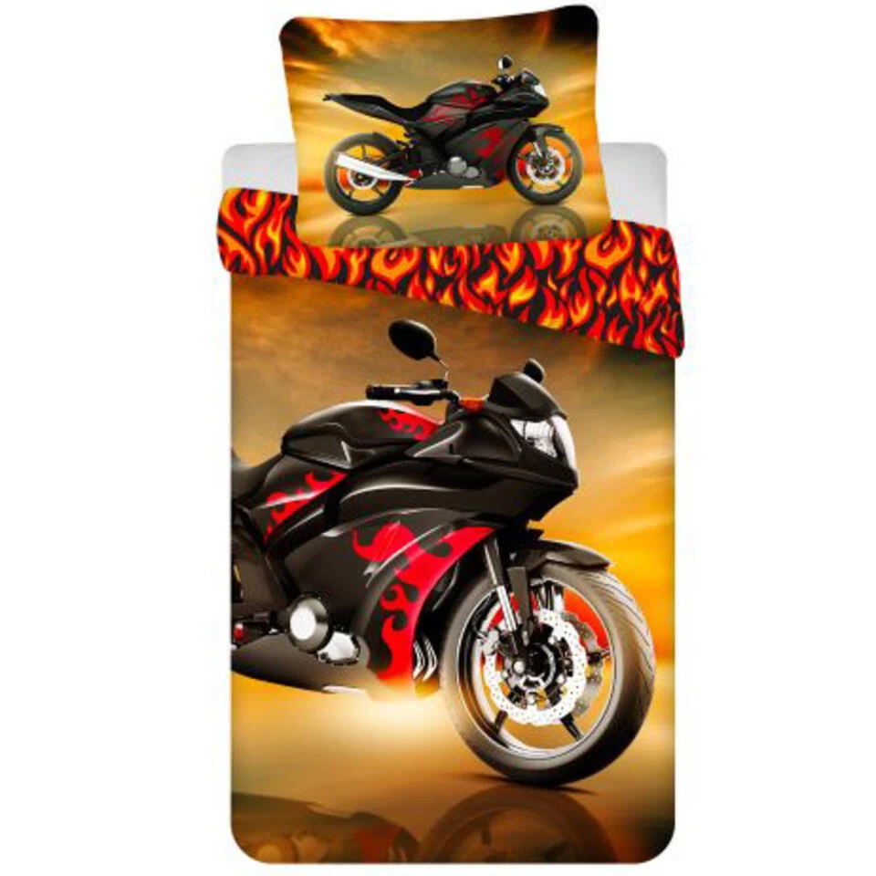 Motor Dekbedovertrek, Flame. Wauw! Dat is nog eens een blikvanger voor de slaapkamer: Dit stoere dekbedovertrek met de afbeelding van een snelle motor. Droom jij ook van deze motoren? Dan kom je met dit dekbedovertrek al een heel eind in de buurt met het tonen van jouw passie. De overtrek is dubbelzijdig bedrukt, met de de achterkant rood met oranje vlammen, net zoals de vlammen op de motor. Dat geeft opties met het opmaken van het bed. Een waanzinnig cadeau voor een motorliefhebber en leuk om te geven voor een verjaardag of de feestdagen!